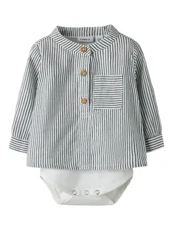 Far Långärmad Skjortbody från NAME IT är ett perfekt plagg för både vardag och fest. Den är sydd i ekologisk bomull som känns mjuk och behaglig mot barnets hud, samtidigt som den är snäll mot miljön. Skjortbodyn har ett tidlöst randigt mönster i färgen Cloud Dancer Navy Blazer, en klassisk krage och fina träknappar framtill. Den smarta bodymodellen med tryckknappar i grenen gör det enkelt att byta blöja och håller plagget på plats hela dagen. En liten bröstficka ger en extra söt detalj och gör skjortbodyn både praktisk och stilren.Specifikationer:Material: 100% ekologisk bomullLång ärmTryckknappar i grenenBröstfickaMaskintvätt 30°CMärke: NAME IT