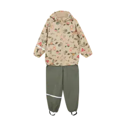 Praktiskt regnklädeset i PU från CeLaVi. Setet består av en jacka med heltäckande tryck och en enfärgad underdel. Byxorna har justerbara hängslen och klickknappar upp till storlek 110, därefter är de utan hängslen. Byxorna har praktiska och justerbara elastiska band som kan dras under skorna. Jackan stängs med dragkedja. Det finns smala reflekterande ränder runt ena armen och ett ben. Logotypen är tryckt med reflekterande bläck längst upp på ena armen och på baksidan av huvan. CeLaVi-regnjackan har en avtagbar huva som fästs med tryckknappar. Öppningen för ansiktet på huvan, ärmarna och midjan har resår för bättre passform. Jackan har en vattentryck på 10 000 mm.Certifierad enligt GRS – Tillverkad av 66 % återvunnet material CERES-0366